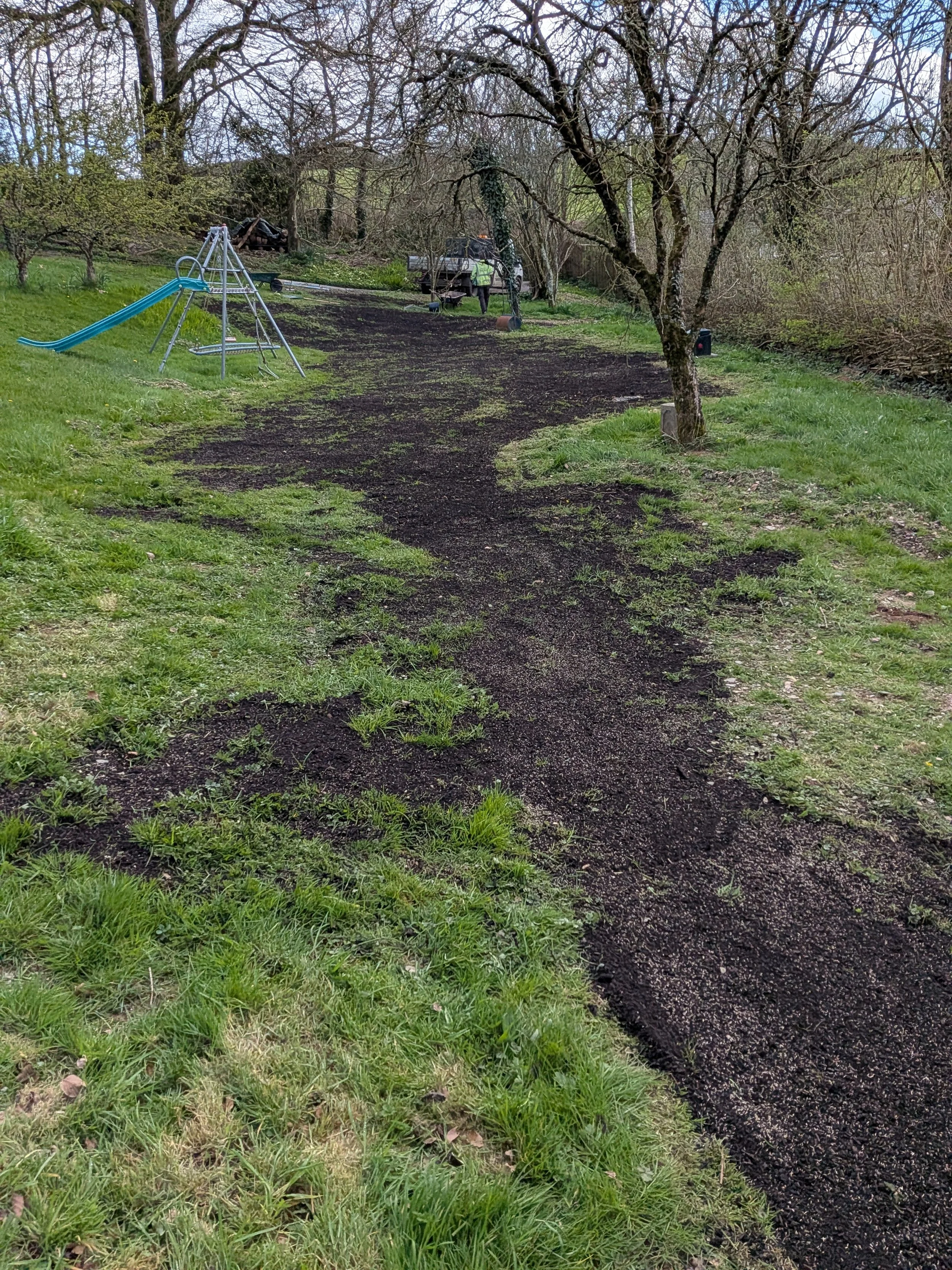 The secret? A heavy serving of "Gardener’s Gold"—specifically, PAS 100 compost from our friends at Wildwoods Contractors. We wheelbarrowed, raked, and seeded today to turn this dirt track back into a garden.